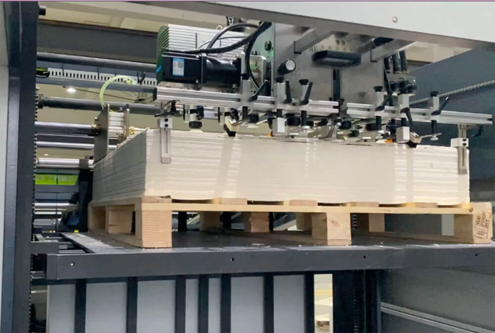 منصة التراص: تم اعتماد منصة تكديس عالية البالغة 1.5 متر ، ويتم تغذية علبة الورق المقوى بأكملها مباشرة بواسطة الرافعة الشوكية. | تلقي حزام النقل: اللوحة بالترتيب ، والمواد التي تستقبلها سريعة ومريحة. | يتم اعتماد منصة تكديس المنتج النهائي على ارتفاع 1.2 متر ، ويمكن فتح الباب الخلفي للتكديس وسحبه عن طريق الرافعة الشوكية. | حزام الانتقال المتوسط: انقل أول شريط من الورق المقوى إلى الأجنحة الثانية. |